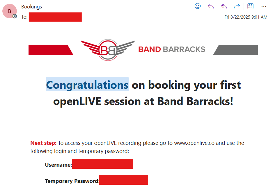 After the openLIVE feature has been added and your booking is confirmed, you will receive an email with your openLIVE login details. Use these credentials to log in to their website and access your recording.