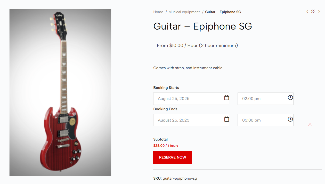 - Once you’ve set the date and time, click the Reserve Now button. The gear will then be added to your cart.