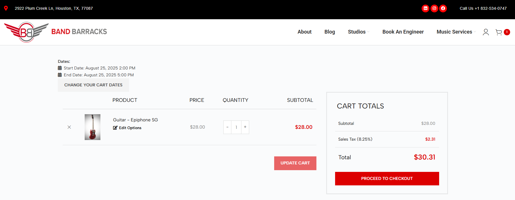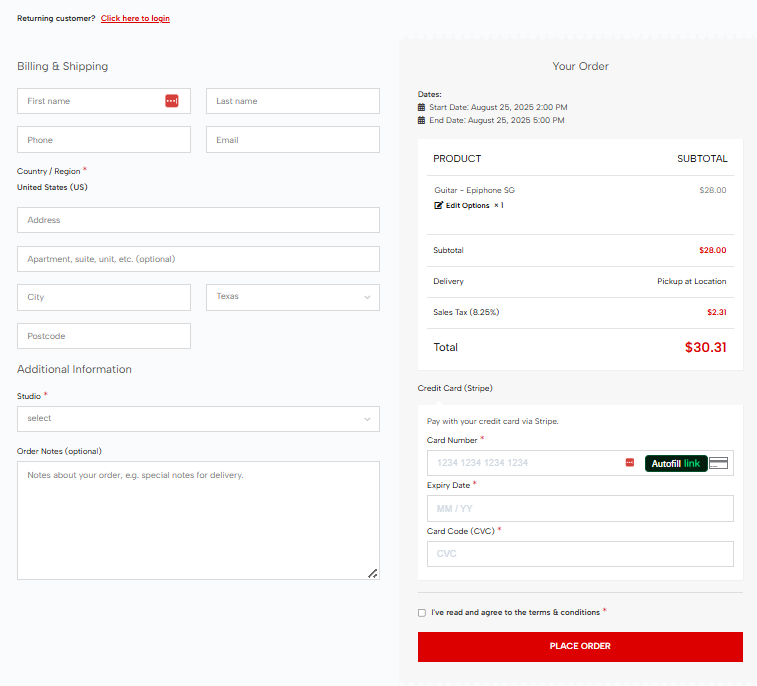 - After reviewing, click the Proceed to Checkout button and enter your billing details to continue. Please be sure to put the correct Studio Number where you will be using the rented gear.